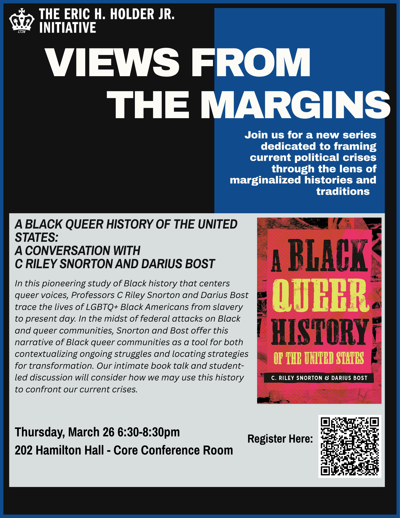 In this pioneering study of Black history that centers queer voices, Professors C Riley Snorton and Darius Bost trace the lives of LGBTQ+ Black Americans from slavery to present day. In the midst of federal attacks on Black and queer communities, Snorton and Bost offer this narrative of Black queer communities as a tool for both contextualizing ongoing struggles and locating strategies for transformation. Our intimate book talk and student-led discussion will consider how we may use this history to confront our current crises.