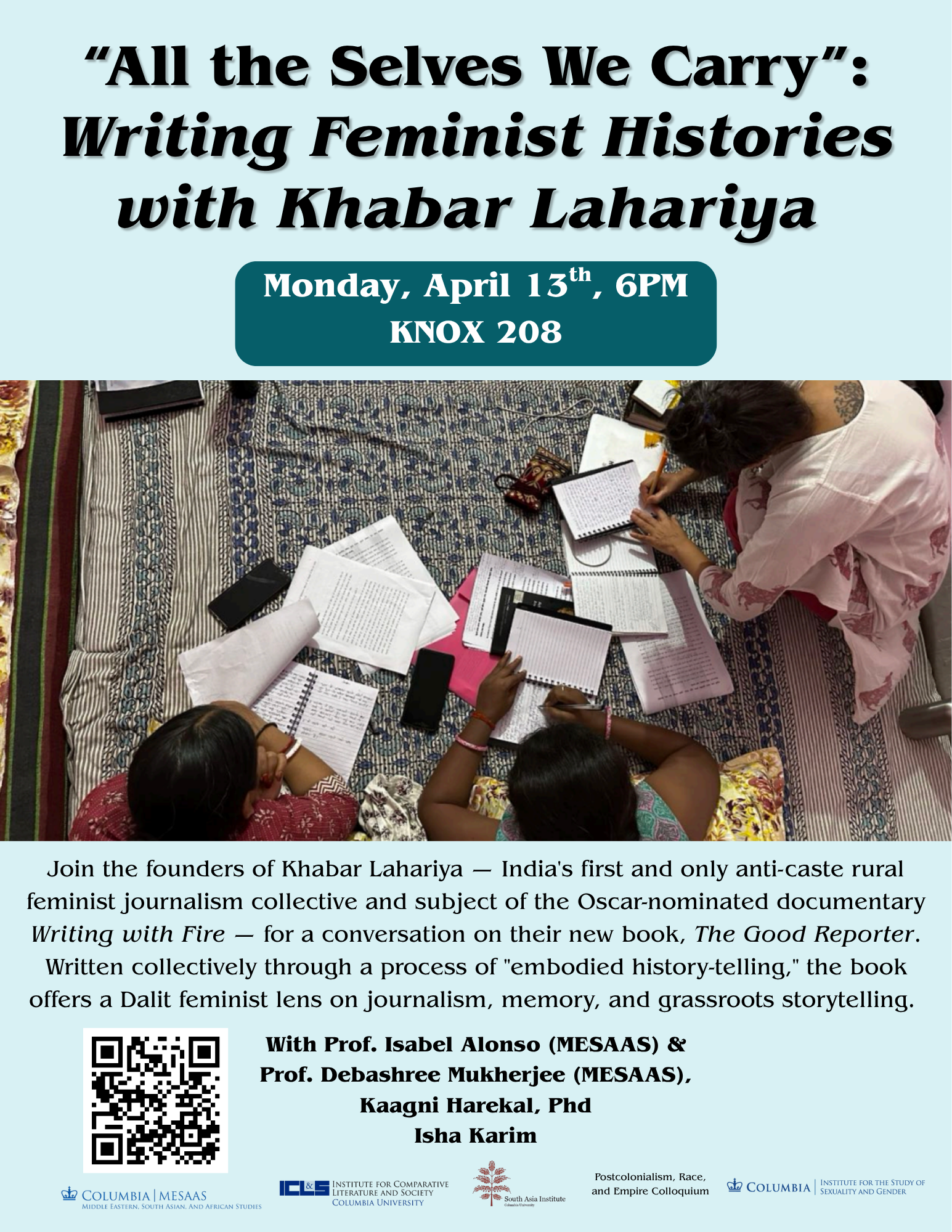 Join Columbia MESAAS for a roundtable and book talk with the founders of Khabar Lahariya, India’s first and only anti-caste rural feminist journalism collective and subject of the Oscar-nominated documentary Writing with Fire. The event will feature a conversation on their new book, The Good Reporter, written collectively by KL’s reporters through a process of “embodied history-telling.” Centering Dalit feminist practices of journalism, memory and remembering, and organizational history, the book significantly complicates the popular narrative that has often been used to tell KL’s story and offers insight into the lived reality of working and thinking as an anti-caste feminist collective.