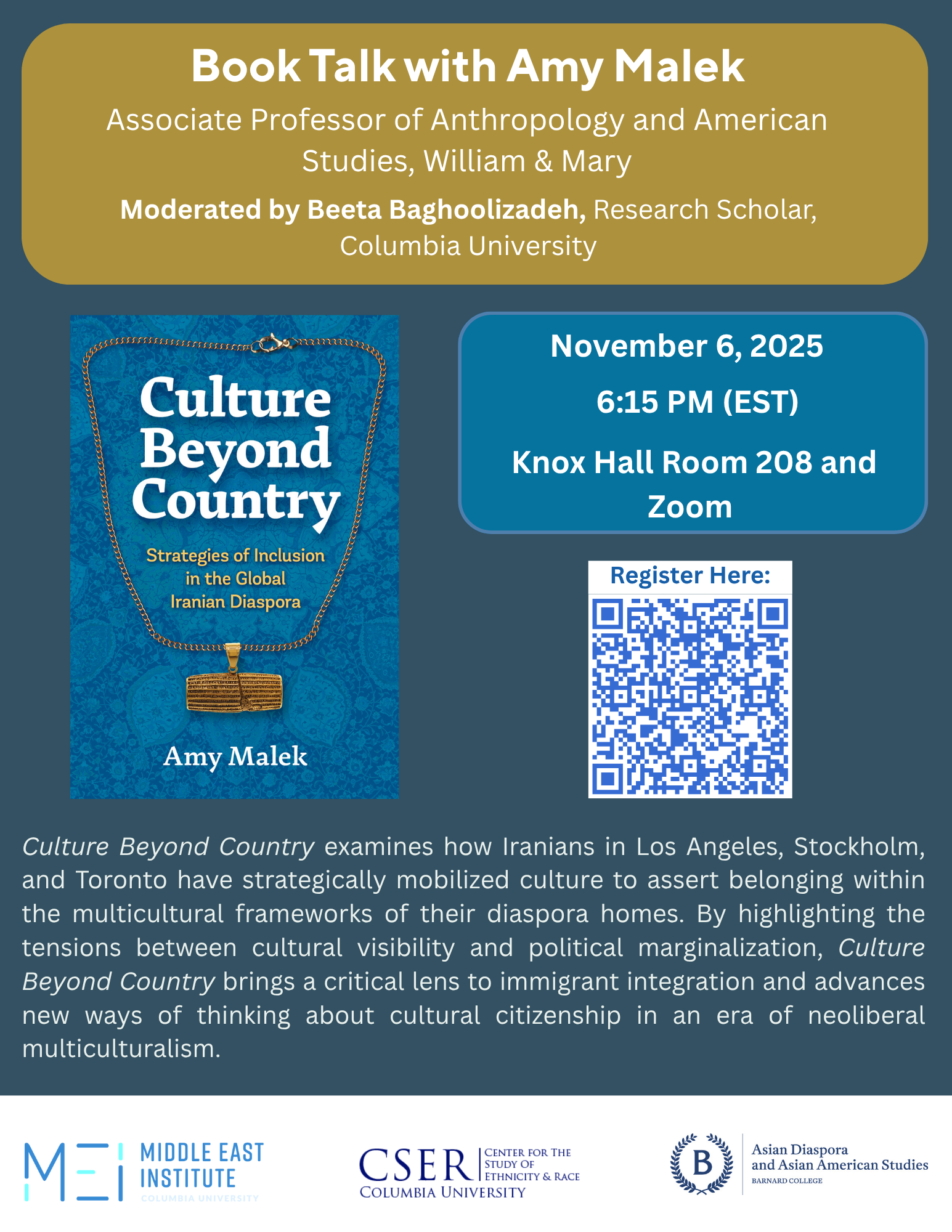 Join the Middle East Institute, Center for the Study of Ethnicity and Race, and Asian Diaspora and Asian American Studies at Barnard for a book talk with Amy Malek, Associate Professor of Anthropology and American Studies, William & Mary. Moderated by Beeta Baghoolizadeh, Research Scholar, Columbia University.
