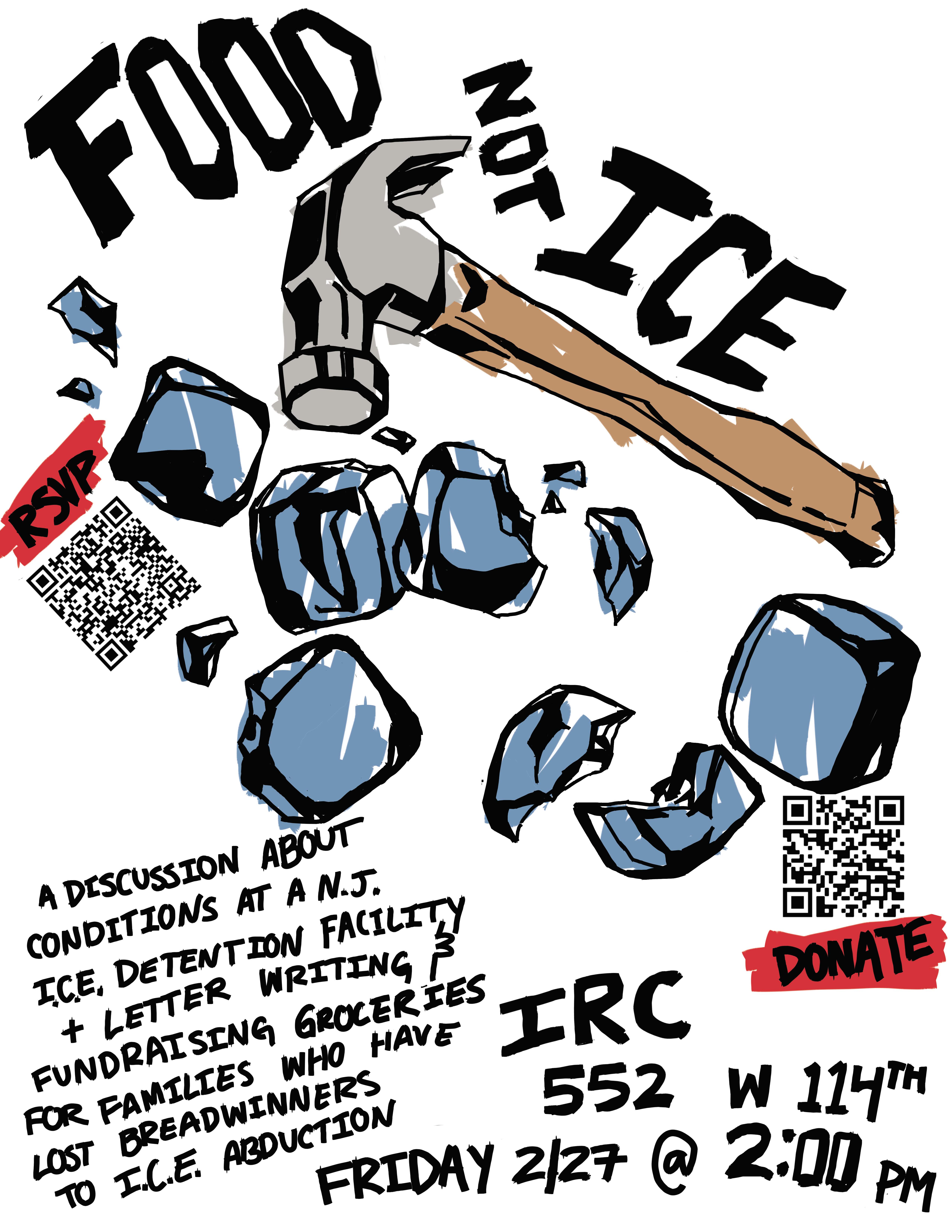 The Intercultural Resource House and Center under Multicultural Affairs at Columbia invites you to their upcoming “Food not ICE” event. The event will include a discussion about conditions in a New Jersey ICE detention facility alongside letter writing, a donation drive, and a fundraiser featuring student art prints.