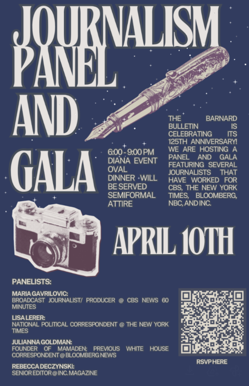 The Barnard Bulletin is celebrating its 125th anniversary! Founded in 1901, The Bulletin has served as Barnard College’s student-run, undergraduate newspaper that prioritizes ethical reporting through an intersectional feminist lens. To celebrate this occasion, we are hosting a panel and gala featuring several journalists that have worked for CBS, The New York Times, Bloomberg, and Inc.