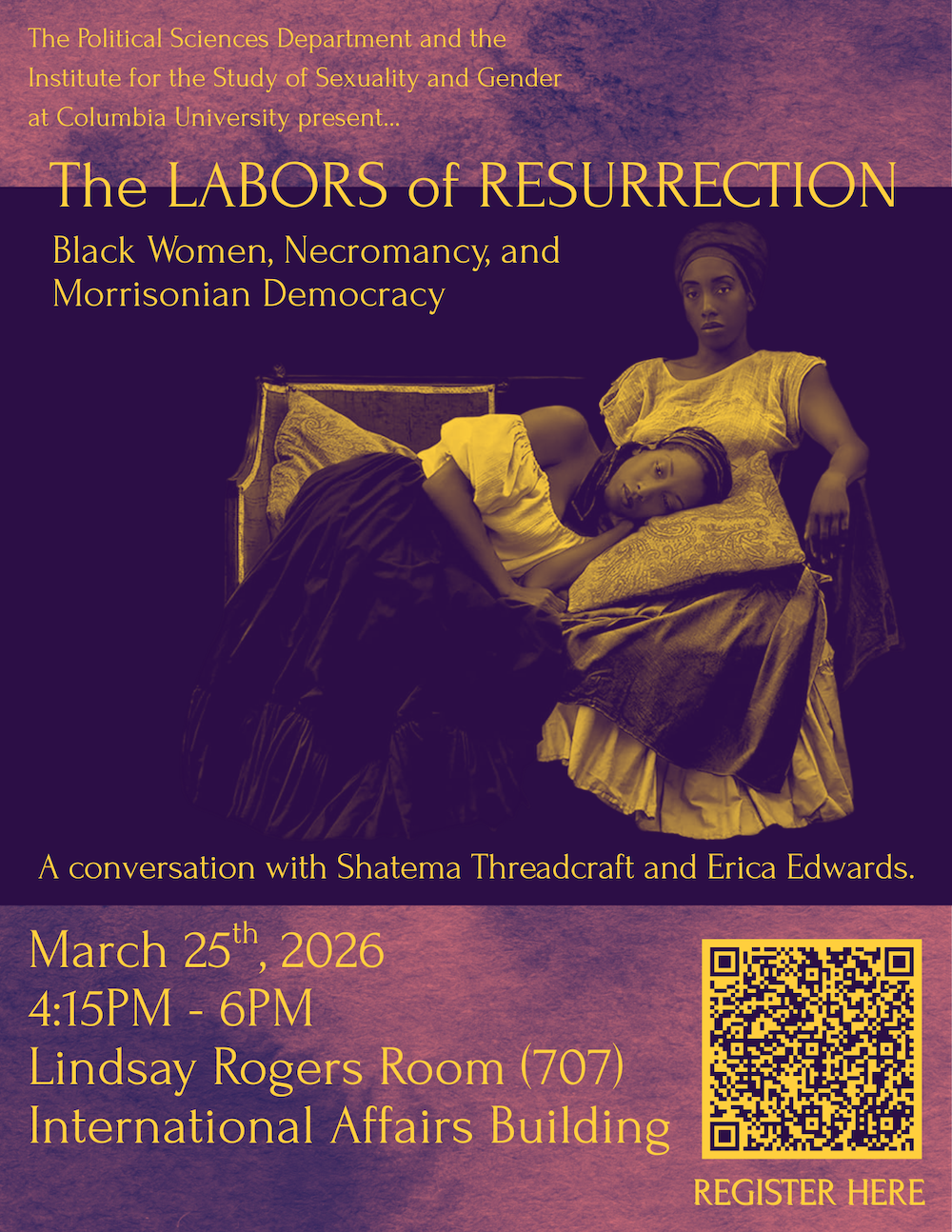 Please join the Political Sciences Department and The Institute for the Study of Sexuality and Gender for a discussion on The Labors of Resurrection: Black Women, Necromancy, and Morrisonian Democracy by Shatema Threadcraft. This event will feature Shatema Threadcraft (Vanderbilt University) in conversation with Erica Edwards (Yale University).